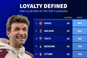体育资讯4月1日讯 德国转会市场统计了五大联赛历史一人一城球员的出场次数,并列出榜单,吉格斯、马尔蒂尼、托蒂位居前三,穆勒排名第6位。